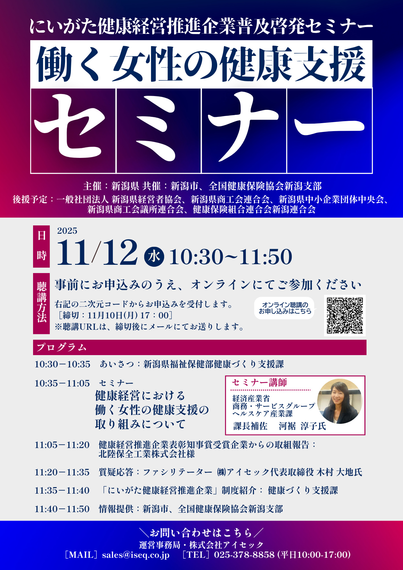 本セミナーは、新潟県様が推進する「にいがた健康経営推進企業」制度および健康経営の取り組みについて、広くご理解を深めていただくことを目的としております。